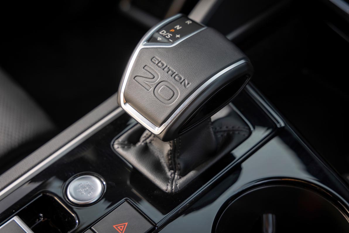 The exclusivity of the Volkswagen Touareg “EDITION 20” is continued in the ultra-modern interior. When getting into the vehicle, the driver and occupants are welcomed by illuminated sill panel trim with the “EDITION 20” logo. High-quality black Savona leather seats with distinctive diamond stitching and seams in the contrasting colour Ceramique, a light beige, underline the extremely stylish overall impression. The sporty character is highlighted by red accents: Perfectly matched double seams (piping) in Ceramique/Red can be found on the dash panel, steering wheel and door inner sides. The leather-covered selector lever for the automatic gearbox features the “EDITION 20” logo.