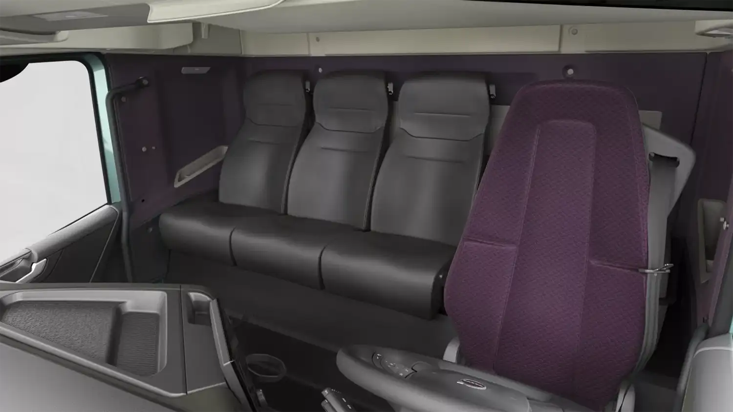 - Three seat options are available: Driver + 0, 1 or 3 passengers. With 3 passenger seats placed at the back of the cab, they are not in the view of the driver. This minimizes blind spots and contributes to excellent visibility.