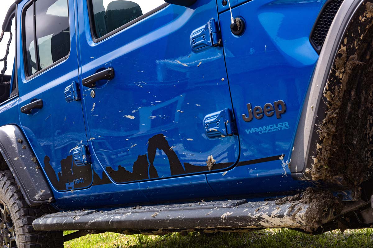 As for the “Off-road” customizations, the clear standouts are the black Tube Steps paired with door sill guards with the Wrangler logo and the front grille. Likewise, for more intrepid experiences, the highlights are the rear door table with an iconic Jeep design and the basket with mesh to secure cargo in the boot. The customizations continue with the various stickers available such as the “Moab” graphic on the side or the famous “1941” on the bonnet, of course referring to the symbolic date for the Jeep brand, the creation of the Willys.