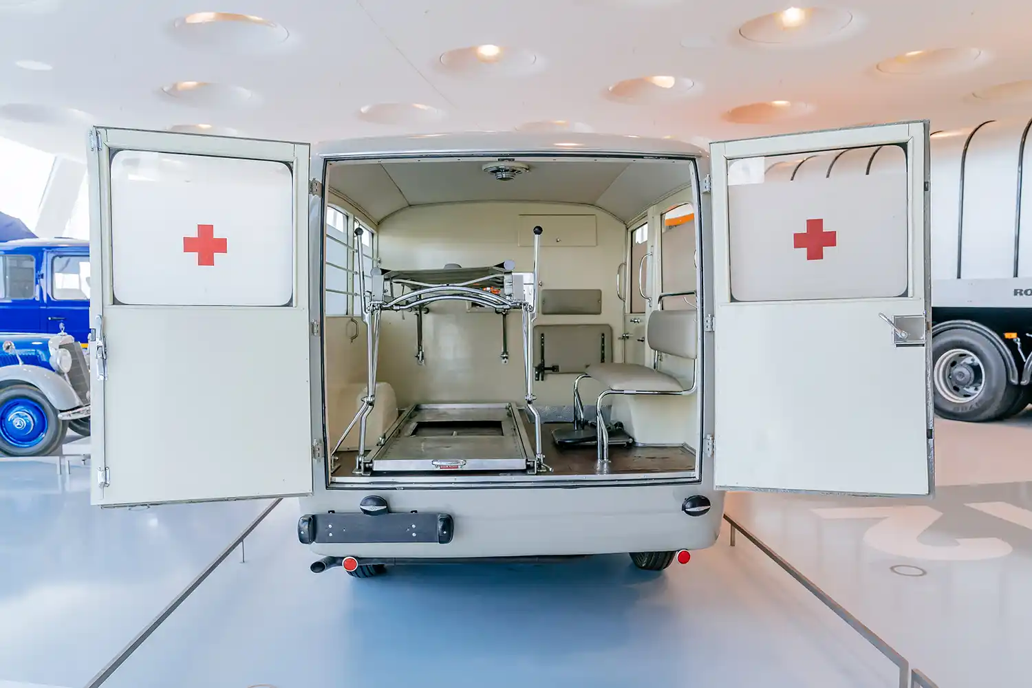 Emergency medical care and the motor vehicle: 86 years ago, in the event of an accident or other medical emergency, the focus was not on first aid at the scene of the incident, but on fast and reliable transport to a hospital or doctor’s office. But at least the ambulance already provided options for emergency treatment en route. What measures were carried out at the time? The exhibit at the Mercedes-Benz Museum gives us clues: there is a holder for a cylindrical object – perhaps a gas cylinder for respiration. There is a kidney dish in a compartment in the partition facing the driver.
