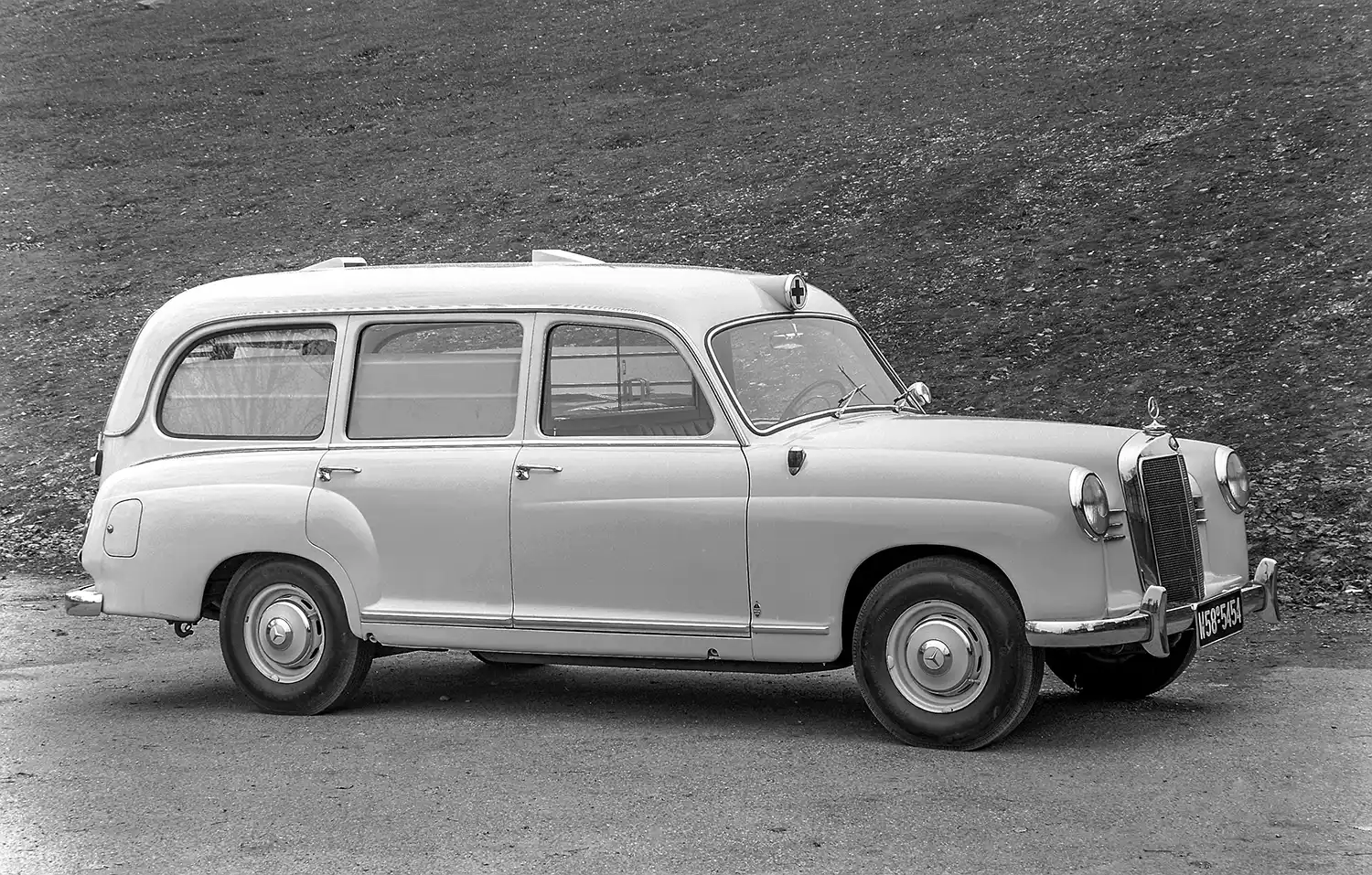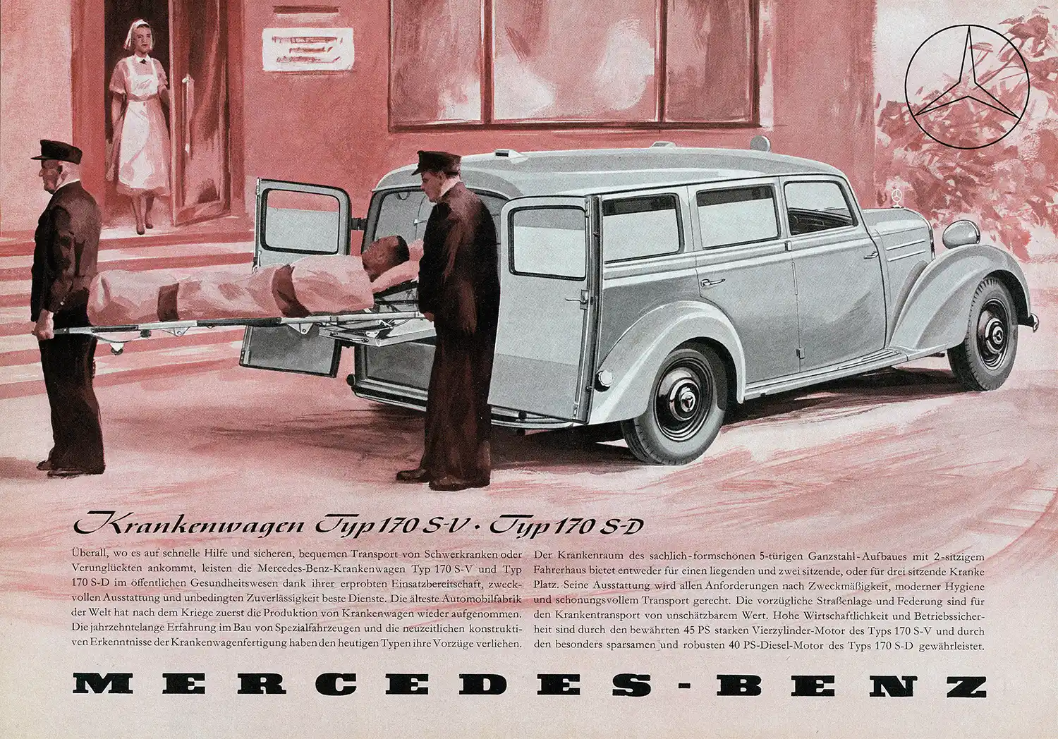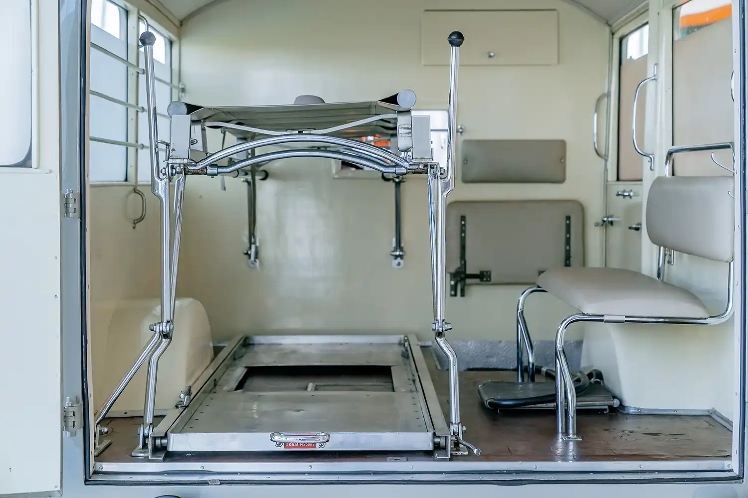 More than “rear-view mirror rescue”: Musical instrument manufacturer Hohner in the German town of Trossingen purchased the ambulance based on the comfortable Mercedes-Benz 320 (W 142), presented in 1937 and featuring a 57 kW (78 hp) 3.2-litre six-cylinder engine, for its company medical service. Open the two side-hinged rear doors and you’ll find stretchers for two patients on the left-hand side, one above the other. The lower stretcher can be loaded and unloaded quickly and gently, as it rests on a rail-guided roller-mounted bogie. The bench seat on the right is presumably for an attendant – ideally medically trained. There is also a folding seat. All in all, the vehicle offers a better standard than the so-called “rear-view mirror rescue”: until the nationwide introduction of the modern ambulance service, the paramedic doubled as the driver and kept an eye on the patient in the rear-view mirror while driving.