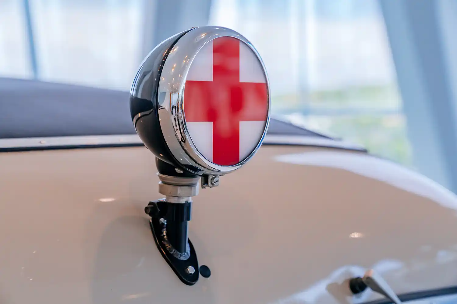 With its inconspicuous grey paintwork, the Mercedes-Benz ambulance built in 1937 differs significantly from today’s standard. This is demonstrated by its immediate neighbours in the Mercedes-Benz Museum: a few vehicles further on, in the Collection Room 3: The Gallery of Helpers, is an emergency ambulance dating from 2001 that has a box body based on the Mercedes-Benz Sprinter – with blue lights, siren and the familiar livery in bright colours. The Mercedes-Benz 320 ambulance at the Museum, on the other hand, does not yet have the visual and acoustic warning functions that have been standard since the middle of the 20th century. In technical jargon, these are referred to as blue “rotating beacons” and a “two-tone horn”. Instead, a simple Red Cross sign lights up above the windscreen during operations.