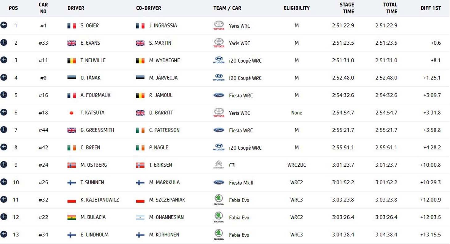 Although the French pair made a minor error, they went quickest through the run to lay down the gauntlet for Evans/Martin. The Britons appeared to have done just enough until they slid wide on a right-hander within sight of the charge to the finish. Starved of vital traction as they mounted an earth bank, the seconds lost meant they completed the stage 4.5s slower than Ogier/Ingrassia to lose the rally by 0.6s.