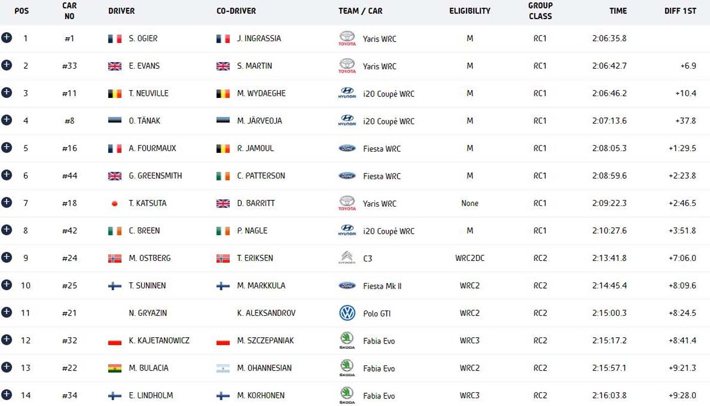 Ott Tänak/Martin Järveoja hold fourth overnight with Adrien Fourmaux/Renaud Jamoul fifth and Gus Greensmith/Chris Patterson in sixth. Greensmith/Patterson began SS14 in seventh but climbed one position when Pierre-Louis Loubet/Vincent Landais crashed into a ditch, albeit without injury to either driver or co-driver.