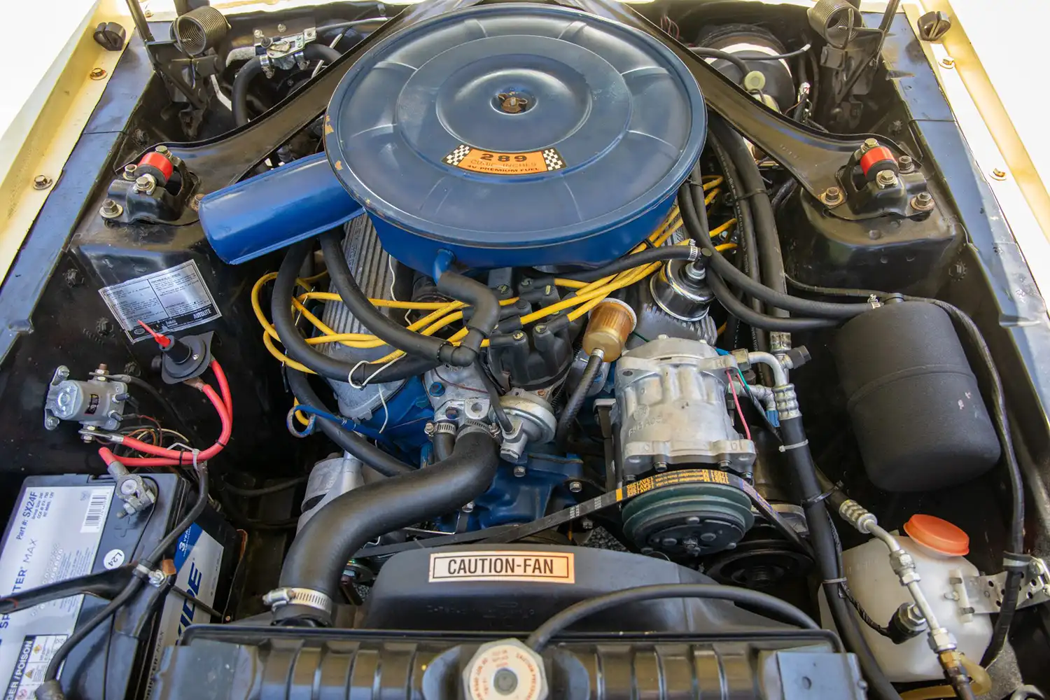 Suspension and Handling Upgrades: Under the current ownership, significant attention has been paid to improving the Mustang’s driving dynamics. The suspension system has been completely overhauled, resulting in a smoother and more controlled ride. A modern Borgeson power steering system has been installed, providing enhanced steering feel and ease of maneuverability. The car now rides on iconic 15″ American Racing Torq Thrust D wheels, wrapped in Cooper Cobra Radial G/T tires, combining classic styling with modern tire technology. Braking is effectively handled by power-assisted front disc brakes and traditional rear drum brakes.